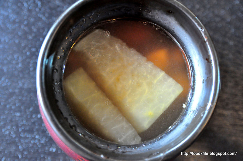「湯王」即叫即上,似乎老闆對自家出品幾有信心的,將配料加入已滾好的肉湯,小盅燉製。湯底本身夠味,再加上冬瓜、瘦肉及瑤柱等配料,還有「師傅」助陣,味道幾濃的,可惜欠一點處理功夫,喝起來是濁而多油,而冬瓜頗實,所謂的「燉」不過是招徠,說穿了是似滾湯多一點。